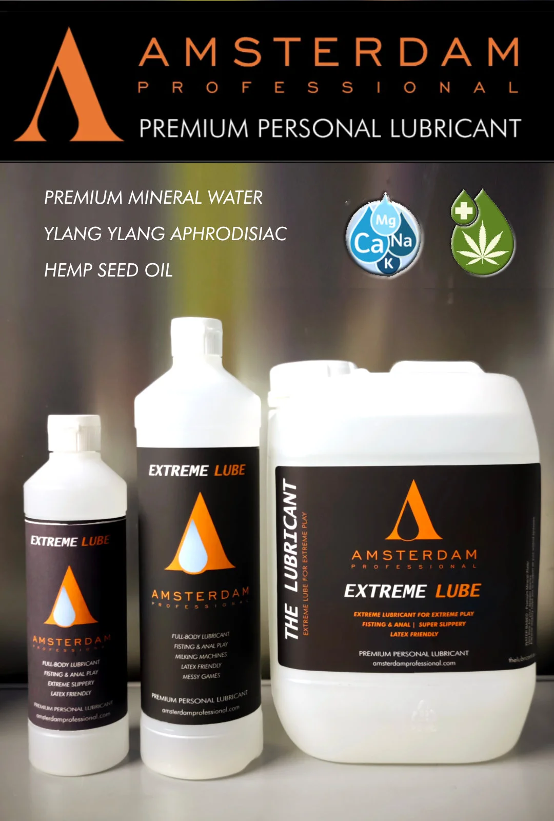 In-house development and production to the highest standards. The Premium- and Custom Line of our Amsterdam Professional Lubes are handmade/ handbrewed with passion from only the best ingedients, using premium mineral water and cold pressed organic oils.